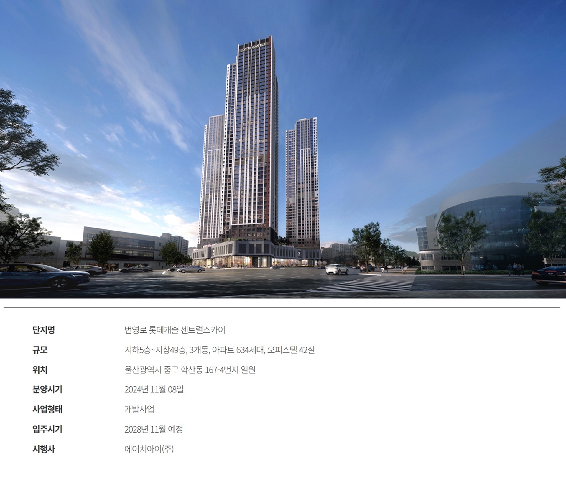 SPECIAL 01 번영로 롯데캐슬 센트럴스카이 생활 인프라 도심 접근성과 쾌적함을 동시에 누리는 프리미엄 라이프를 누립니다. 더 알아보기 SPECIAL 02 입지 및 교통 교통팔달·친환경·교통·생활·미래가치·도보권 생활시설를 모두 갖춘 번영로 롯데캐슬 센트럴스카이 입지! 더 알아보기 SPECIAL 03 분양 및 금융 조건 초기 부담은 낮추고, 미래 가치는 극대화한 분양조건, 다양한 금융 혜택과 맞춤형 분양 옵션 제공 더 알아보기 SPECIAL 04 단지 구성 및 설계 번영로 롯데캐슬 센트럴스카이 프리미엄 설계로 완성한 고급 커뮤니티와 다양한 평면구조 적용단지 더 알아보기 SPECIAL 05 주변 개발 미래가치 미래 개발 잠재력을 갖춘 전략적 핵심 입지 편리한 생활 인프라 동시 확보 더 알아보기 SPECIAL 01 번영로 롯데캐슬 센트럴스카이 생활 인프라 도심 접근성과 쾌적함을 동시에 누리는 프리미엄 라이프를 누립니다. SPECIAL 02 입지 및 교통 교통팔달·친환경·교통·생활·미래가치·도보권 생활시설를 모두 갖춘 번영로 롯데캐슬 센트럴스카이 입지! SPECIAL 03 분양 및 금융 조건 초기 부담은 낮추고, 미래 가치는 극대화한 분양조건, 다양한 금융 혜택과 맞춤형 분양 옵션 제공 SPECIAL 04 단지 구성 및 설계 번영로 롯데캐슬 센트럴스카이 프리미엄 설계로 완성한 고급 커뮤니티와 다양한 평면구조 적용단지 SPECIAL 05 주변 개발 미래가치 미래 개발 잠재력을 갖춘 전략적 핵심 입지 편리한 생활 인프라 동시 확보